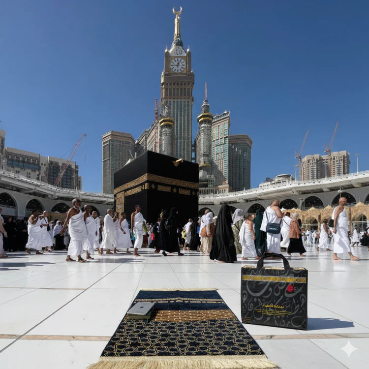 The beauty of the design blends elegantly with the black color in the cover's (Kiswa) rug, which reflects the creativity of the Holy Kaaba design.