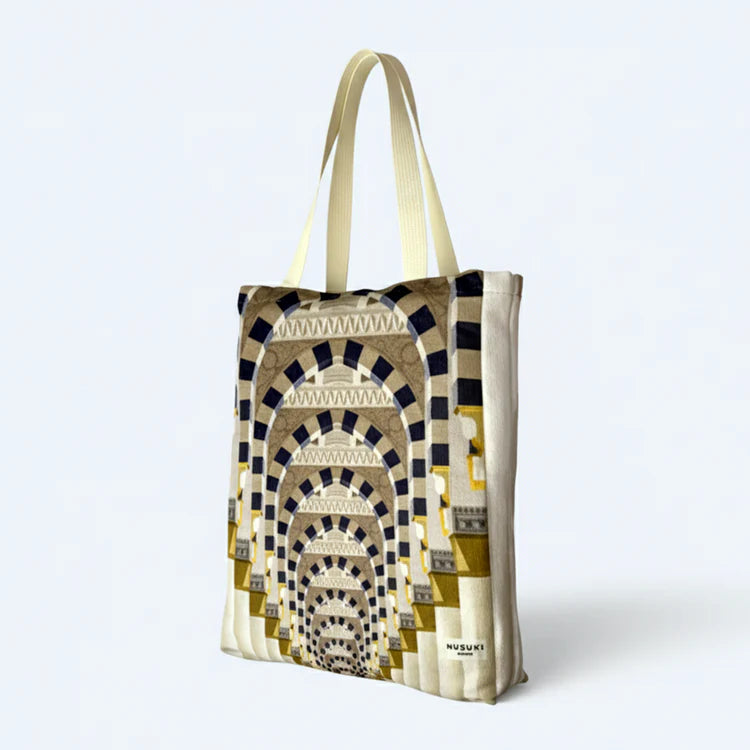 A modern luxurious prayer mat that reflects the beauty of the arches in the architecture of Madina Mosque (Al-Masjid Al-Nabawi).