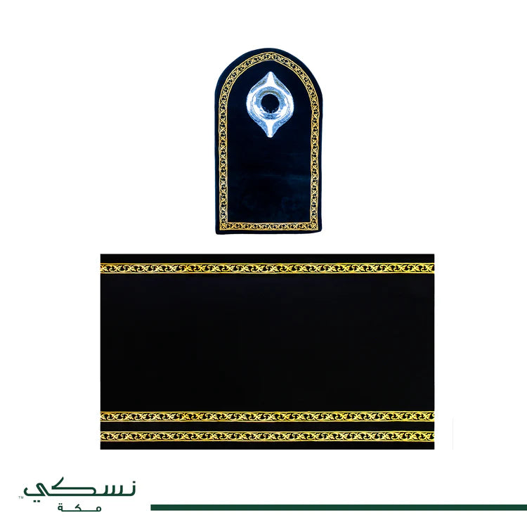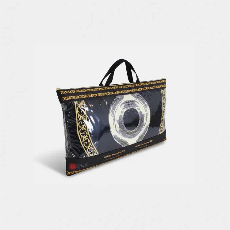 Potable Mosque, is a set of Black stone prayer mat and a Kabba Mussalla mat for four prayers behind the Imam. The mats are featuring a quiet simple design with islamic pattern on borders of them. This is your perfect choice for your family and friends gamáa prayers.