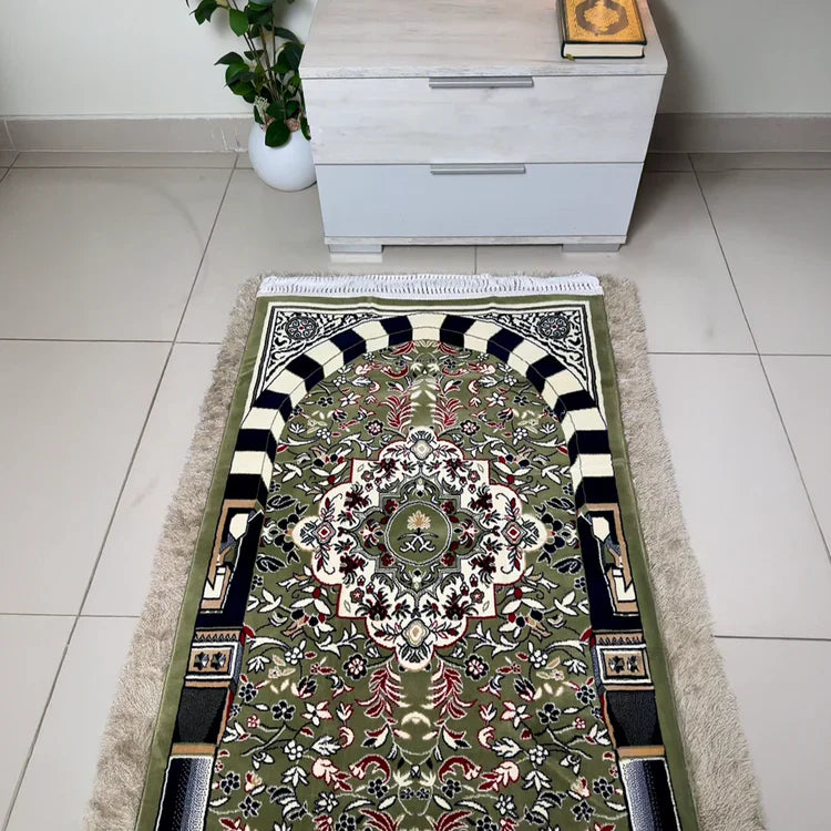 Riyadh Al Salihyen Luxury Prayer Mat, this prayer rug combines the spirituality and beauty of the architecture of the Madina Mosque (Al-Masjid Al-Nabawi). Each rug is featuring a unique design from an angle in Prophet's Mosque to remind you of that beautiful place.